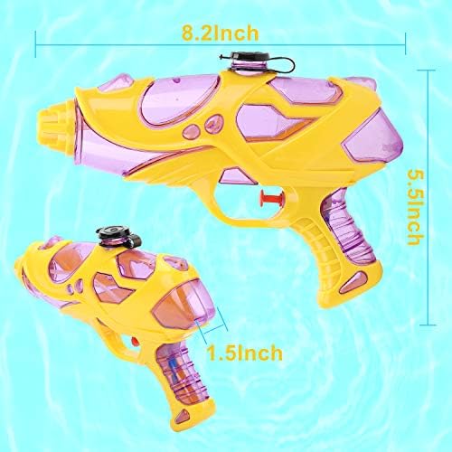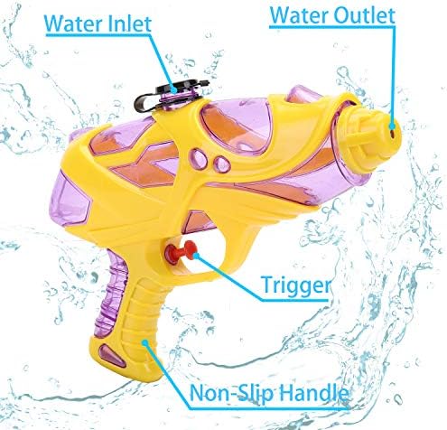 <br>💧2 Pack Pistole ad Acqua Super Value👉 - Puoi giocare con i tuoi figli,può aggiungere una sensazione di freschezza a questa calda estate e crea ricordi preziosi con i tuoi bambini.Regalo ideale per compleanni, festa dei bambini, ringraziamento e Natale.<br>💧Fashion Design👉 - Le nostre pistole ad acqua piccola sono trasparenti ed eleganti, contiene due colori,tuo figlio lo adorerà.L'impugnatura ergonomica è facile da presa,è così leggere che i bambini non si sentono pesanti e stanchi quando giocare.<br>💧Poligono di Tiro e Capacità👉 - I nostri pistola ad acqua potente possono contenere 200 ml di acqua,puoi riempire il serbatoio in pochi secondi,sparare fino a 16 piedi!(Nota: non sparare direttamente all'occhio o al viso).<br>💧Giocattoli d'acqua per la Calda Estate👉 - Perfetto per piscina all'aperto, spiaggia, festa in acqua, cortile, giardino e vacanze.Adatto a bambini di età superiore a 3 anni.