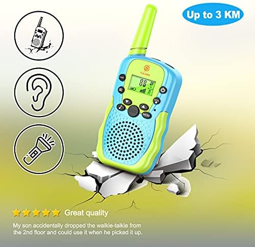 Super qualità: costruito con materiali resistenti e amichevoli, il walkie talkie è molto sicuro e adatto ai bambini. La torcia a LED integrata può essere utilizzata come flash e luce di emergenza per un divertimento ancora più incredibile per i bambini in ambienti bui per le avventure notturne.