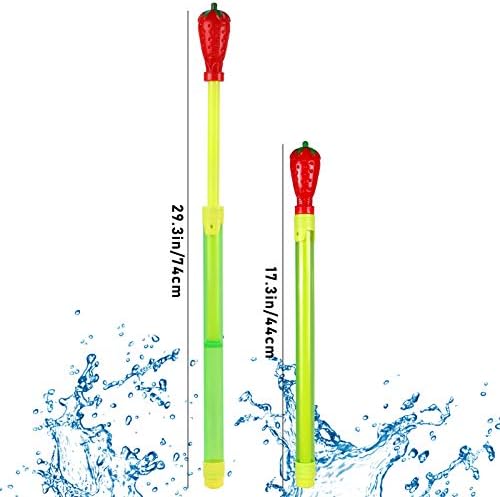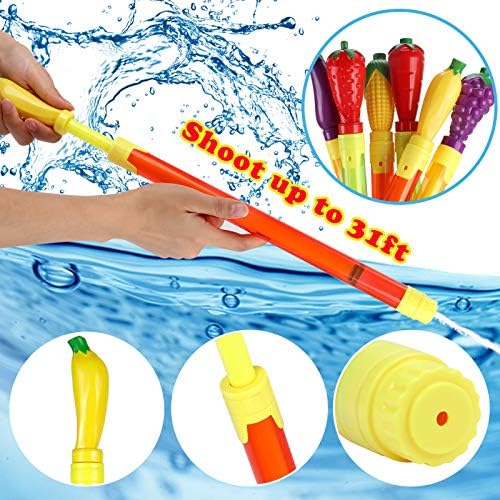 <br>DISTANZA MAGGIORE FINO A 10 M - Diversamente dagli altri blaster ad acqua, la pistola ad acqua per frutta e verdura è più lunga e può promettere un lungo raggio per un gruppo di bambini e adulti. Sarà una grande fonte di divertimento per una calda giornata estiva!<br>CAPACITÀ D'ACQUA ELEVATA - Questo blaster ad acqua può contenere fino a 100 ml di acqua. Con un ammollo estremo, bambini o adulti possono godersi l'estate. Questo tubo del getto d'acqua è un prodotto di grande valore e perfetto per un'attività divertente con un grande gruppo, come compleanni, feste in piscina e giochi in spiaggia.<br>IDEALE PER LE ATTIVITÀ DI GRUPPO - Perfetto per attività all'aperto, come il combattimento acquatico estivo, il divertimento in famiglia, la piscina, il cortile, la sabbia, la spiaggia e le feste. È tempo per te, le tue famiglie e i tuoi amici di combattere quest'estate.<br>ALTA QUALITÀ E FACILE DA USARE - Questa pistola ad acqua è realizzata in plastica molto solida e non tossica e il manico è molto robusto, offrendo una presa super confortevole per il giocatore. Hai solo bisogno di tirare indietro la maniglia per riempire il serbatoio e spingere per spruzzare un enorme getto d'acqua.