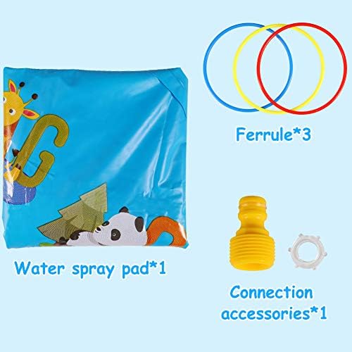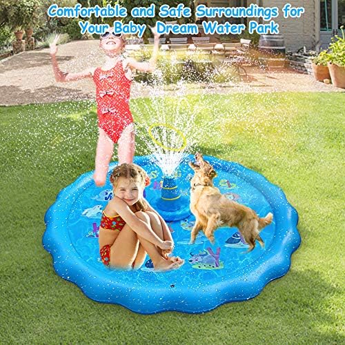 Piscina per bambini gonfiabile in PVC, sicura e divertente · Modello adorabile, mini mondo marino per i bambini e i loro partner · Facile da installare, collegata al tubo da giardino standard e giocare · L’acqua spruzza leggermente in tutte le direzioni verso il centro · Design con bordo arrotondato per mantieni i bambini nel cerchio sicuro · Base ispessita, i bambini possono sentirsi liberi di saltare e giocare all’interno · Adatto per giochi all’aperto, prato, cortile e giardino, ecc.