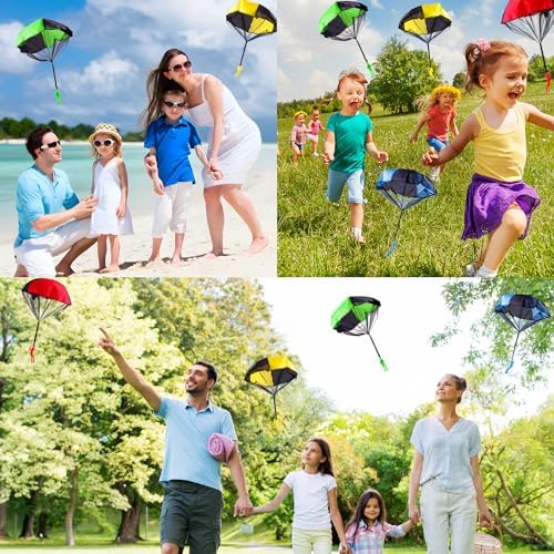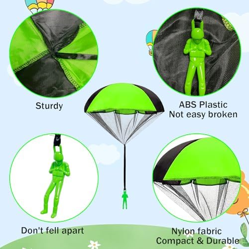 【Set di giocattoli con paracadute】 Il pacchetto viene fornito con 4 pezzi di paracadute da lancio in 4 colori, come il verde, il giallo, il rosso e il blu. Le dimensioni del paracadute portatile sono 48 cm x 43 cm, è di piccole dimensioni e leggero, adatto per essere portato in giro e giocare a volontà. L’altezza del lancio determina il grado di atterraggio.
