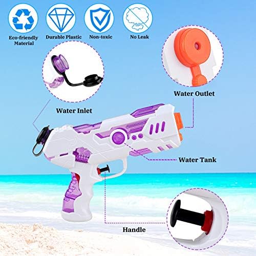 【Pistola ad acqua super conveniente】: confezione da 2 pistole ad acqua (blu e viola), ciascuna misura 20,5 cm (L) X 4 cm (L) X 13,5 cm (A). I bambini si divertiranno di più condividendo questo set di pistole ad acqua con gli amici e Suggerimenti: per i bambini di età superiore a 3 anni, evitare di sparare direttamente al viso e agli occhi.